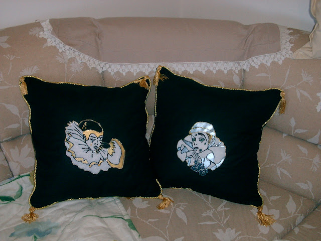 Mais umas cómodas almofadinhas que a minha colega pintou. Gostam? Eu achei lindas...e ai de quem sentar em cima delas hehe