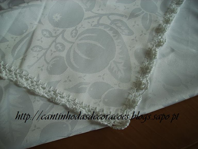 Achei linda, um tecido muito delicado e cheia de belas ramagens. Então aproveitei logo e fiz um croché em volta.